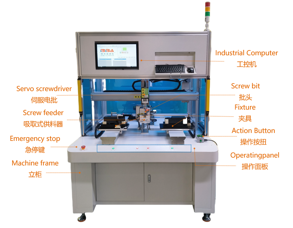 The BBA Screw Fastening Machine for M3–M6 screws integrates error detection, tailored for smart device assembly. It guarantees accurate fastening, identifies installation anomalies in real-time, and optimizes efficiency in precision manufacturing lines.